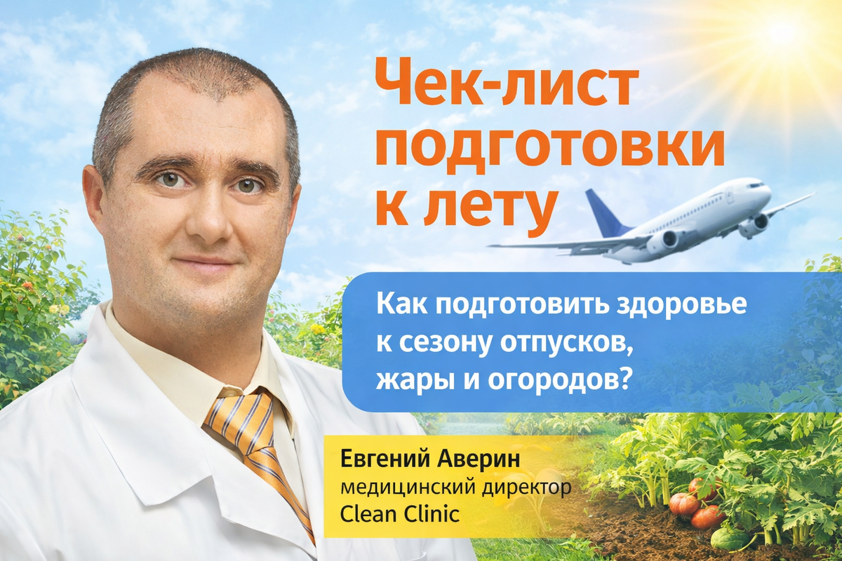 Медицинский директор Clean Clinic, врач кардиолог, д.м.н - Евгений Евгеньевич Аверин Лето — это всегда про движение: отпуска, перелёты, жара, дачные работы, активный спорт. И каждый год я как врач вижу одну и ту же картину — люди начинают заботиться о здоровье уже тогда, когда появились слабость, скачки давления, обострились хронические заболевания или «подкосило» после перелёта. Чтобы лето прошло легко, без неприятных сюрпризов, рекомендую заранее пройти базовую подготовку организма. Делюсь чек-листом, который я в Clean Clinic. Лето — это нагрузка на сердечно-сосудистую систему, сосуды, печень и иммунитет. Минимальный список обследований: Особенно важно пройти обследование, если: Жара усиливает нагрузку на сердце. Перелёты сгущают кровь и увеличивают риск тромбозов. Лучше узнать свои показатели заранее. При температуре выше +28 °C сосуды расширяются, давление может «скакать», усиливается потеря жидкости и электролитов. Что важно сделать заранее: ✔️ Нормализовать давление