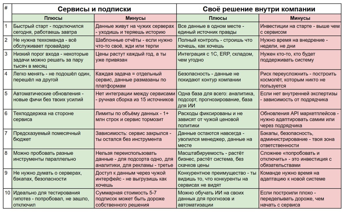 В каждой компании рано или поздно случается этот разговор. Одни говорят: «Зачем строить — есть сервис за 5к в месяц». Другие: «Хватит кормить чужие платформы, давайте сделаем своё». Оба лагеря правы. И оба ошибаются. Разбираю. Лагерь 1: Сервисы и подписки на каждую задачу ✅ Быстрый старт — подключился и работаешь ✅ Не нужна техкоманда ✅ Легко менять — не подошёл один, перешёл на другой ✅ Предсказуемый бюджет помесячно ❌ Один сервис для аналитики, другой для подсорта, третий для рекламы — данные живут в разных местах ❌ Цены растут каждый год, а ты уже привязан ❌ Шаблонные отчёты — если нужно что-то своё, жди обновления или терпи ❌ Данные на чужих серверах — уходишь с одного и начинаешь с нуля на другом Лагерь 2: Строим решение внутри компании ✅ Все данные в одном месте — можно использовать единожды собранные данные для аналитики, подсорта, рекламы, прогнозирования, ну и конечно как базу для ИИ ✅ Полный контроль — интеграция с 1С, ERP, внутренними данными ✅ Расходы фиксированы (инф