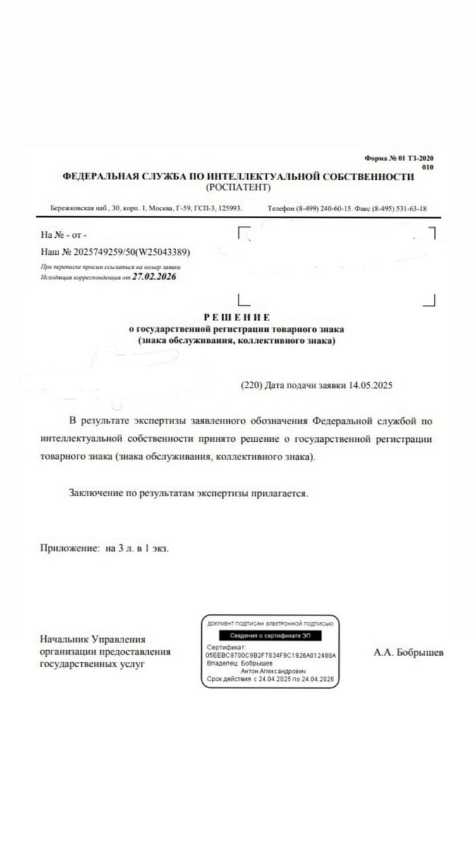 🙌 Ещё один бренд официально под защитой. Для предпринимателя это как поставить надёжный замок на дверь своего бизнеса. Вы вкладываете деньги в рекламу, упаковку, продвижение - и важно быть уверенными, что имя компании принадлежит именно вам. Регистрация товарного знака защищает от копирования, даёт спокойствие при масштабировании и превращает бренд в полноценный актив, а не просто красивое название. За каждым таким решением - не «просто подали заявку», а продуманная стратегия, проверка рисков и аккуратное сопровождение на каждом этапе. В «Кредо» мы работаем системно и на результат - чтобы клиенты могли развивать бизнес без лишних юридических сюрпризов. Если вы строите бренд - давайте сразу делать это правильно. Консультация поможет понять, как защитить своё имя и спать спокойно 😊