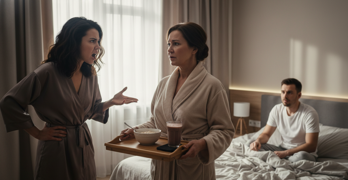 — Доброе утро, детки! — прощебетала свекровь, ставя поднос на тумбочку. — Я вам завтрак принесла. Максимушка, вставай, каша остынет.