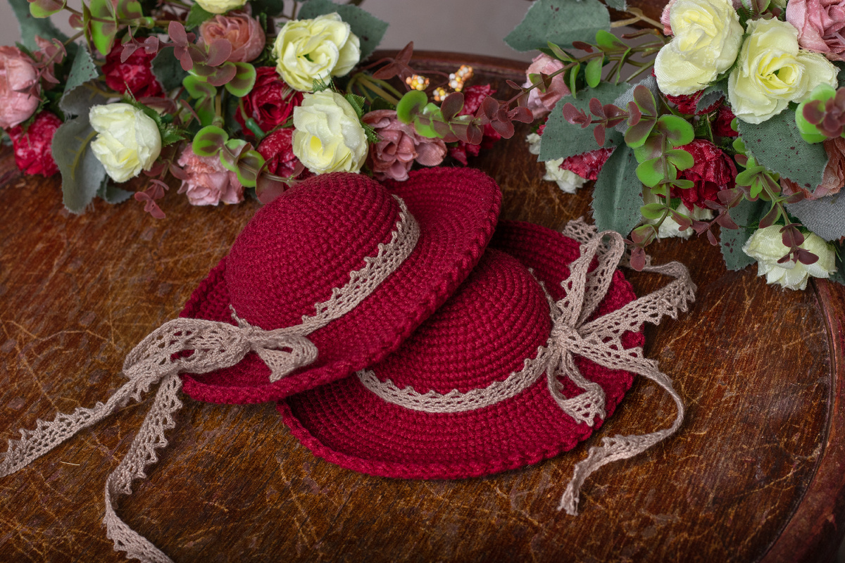 Я вязала из пряжи Ярн Арт Джинс (вообще это моя любимая пряжа) крючком #2,25 (но подойдёт и крючок #2,5 - 3). В конце добавила кружевную ленту. Эти шляпки вязались специально для фотосессии щенков.