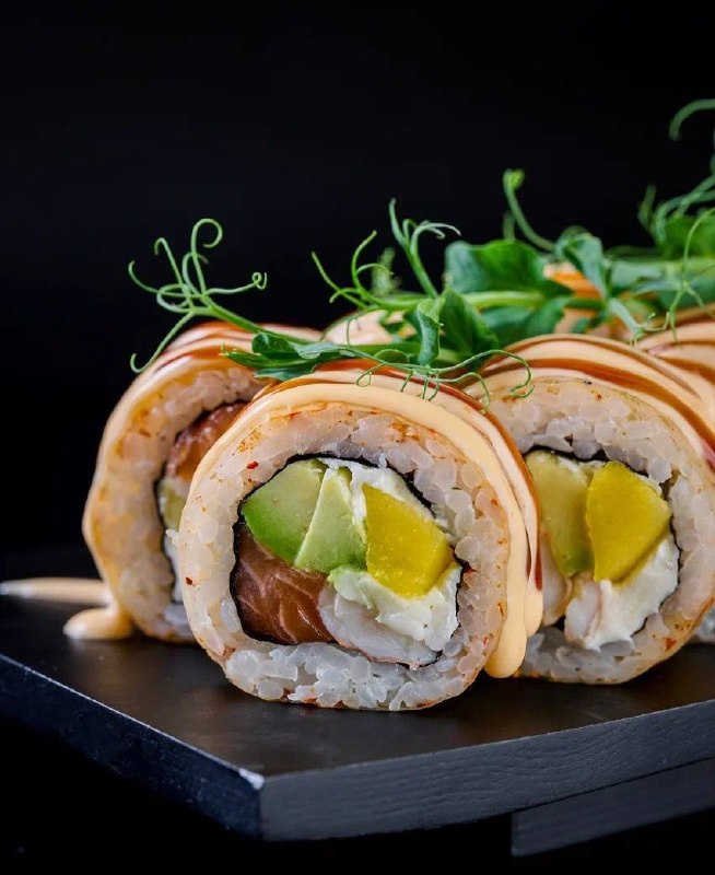 💛 Состав: лосось, креветка, сливочный сыр, манго, авокадо, рис, нори, рисовая бумага, красный соус, соус унаги, микрозелень, перец шичими. 🎁 В подарок к заказу с 2 по 8 марта по промокоду ВАЙБ