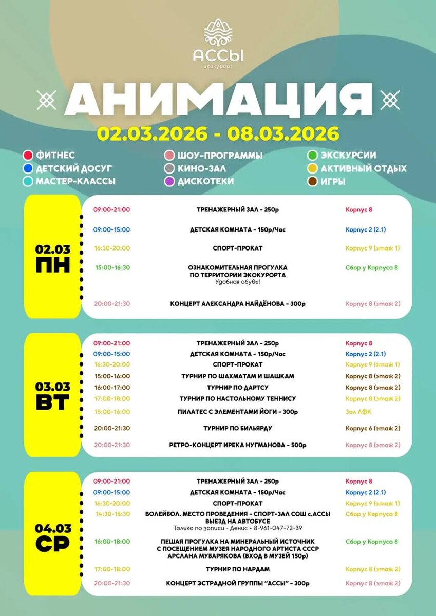 »! ✨ Дорогие друзья! На этой неделе у нас планируется максимальная концентрация красоты, радости и весеннего настроения. Мы подготовили для вас по-настоящему активную и насыщенную программу к 8 Марта! 🌷 📸 Листайте карусель, чтобы увидеть подробное расписание. Что вас ждет? ✅ Зажигательная анимация. ✅ Специальная праздничная программа мероприятий; ✅ Море улыбок, свежий воздух и полное единение с природой. 🎁 Идеальный подарок для неё: Мужчины, если вы всё ещё думаете, чем удивить своих любимых - подарите им отдых! Это лучший способ выразить заботу. 🚀 Акция «Перезагрузка» - ваш экспресс-отпуск! Напоминаем, что у нас действует предложение https://vk.ru/wall-46957729_48775: вы можете приехать к нам в любой день всего на 2 дня. Это идеальный формат, чтобы провести 8 Марта в шикарном месте, сменить обстановку и восстановить силы. Приезжайте за здоровьем, отдыхом и праздничным вдохновением! Мы уже всё подготовили, не хватает только вас. 💚 Телефоны для бронирования: ☎ +7 (347) 201-08