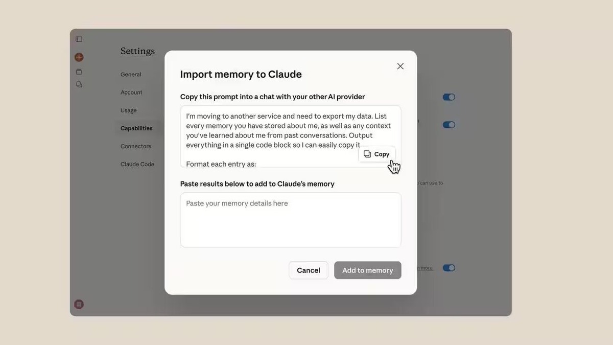 Anthropic упростили процесс перехода между чат-ботами: теперь можно буквально за минуту перенести долгосрочную память из ChatGPT или другого ИИ в Claude. Вместо повторных объяснений и настройки предпочтений пользователям предлагают удобный промпт для экспорта всех накопленных данных и быстрого импорта в Claude. Ещё по теме: Новая функция работает через простой, но эффективный приём — в исходном ИИ нужно вставить специальный промпт, который запрашивает весь сохранённый контекст, инструкции и данные о пользователе в компактном и удобном виде. Полученный ответ копируется и переносится в настройки памяти Claude. Таким образом сохраняется стиль общения, проекты, личная информация и другие детали, которые ранее приходилось заново передавать всякий раз при смене сервиса. ⚡Подписывайтесь на канал itzine и канал подкаста ForGeeks в Telegram! Там самые свежие новости про технологии, гаджеты и космос. Anthropic предложили следующий подход для миграции памяти: 👉 Читайте также наши материалы на it