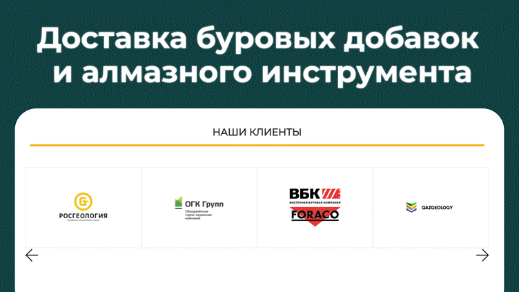 Один из ключевых факторов успеха вашего проекта — это своевременное обеспечение буровыми добавками, алмазным инструментом и прочими необходимыми расходниками. Компания Drill Gecko Group выстроила отлаженную логистическую систему, чтобы вы получали необходимое оборудование точно в срок, где бы ни находилась ваша буровая площадка. ● Развитая складская сеть в стратегических точках России и Казахстана; ● Партнёрство с ведущими транспортными компаниями; ● Полный контроль над процессом отгрузки и движения груза; ● Прозрачные условия для каждого клиента. Мы осуществляем доставку со складов готовой продукции. Чтобы сделать этот процесс оперативным, постоянно поддерживаем складские запасы (более 800 наименований) в наших представительствах, которые находятся в Москве, Санкт-Петербурге, Хабаровске и Алматы. Наши давние партнёрские отношения с канадскими заводами позволяют нам организовать бесперебойные поставки продукции под заказ. Мы берём на себя все заботы: полное таможенное оформление, между