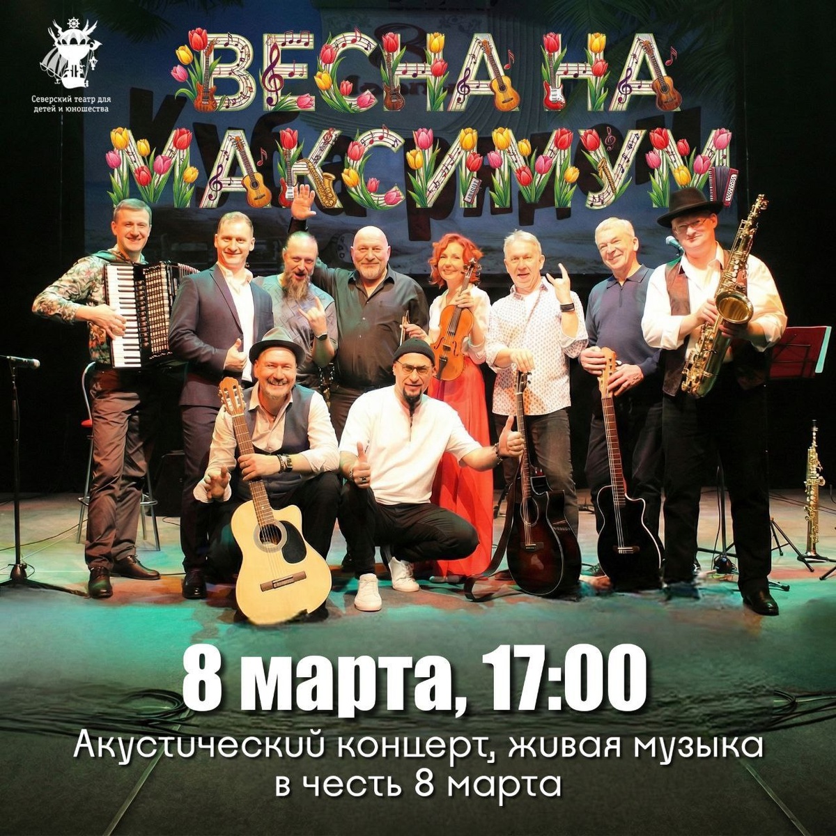 ! Друзья, уже не первый год мы встречаем 8 марта в удивительной компании талантливого мужского трио «Куба рядом» 🎸 Андрей Косолапов (гитара, вокал) 🥁 Алексей Лежнин (перкуссия) 🎷 Николай Новиков (саксофон, кларнет) и их друзей‑музыкантов. Друзья музыканты: 🎸Дмитрий Аверин (бас гитара) 🪗Александр Варлаков (аккордеон) 🎻Елена Юшицина (скрипка) 🎸Михаил Зозуля (гитара, вокал) 🎤Денис Макаров (бэк вокал, гитара) И в этом году нас ждёт особенный вечер, настоящий подарок к празднику: музыканты подготовили новую концертную программу, полную душевных и зажигательных мелодий, знакомых и авторских песен и приятных музыкальных сюрпризов. Пусть этот 8 марта станет ещё одной прекрасной страницей в нашей общей музыкальной истории! 🎸«Весна на максимум» 12+ Акустический концерт. Живая музыка ⏰ 8 марта, 17:00 🎫 Билеты https://quicktickets.ru/seversk-teatr-dyu/s1531 ☎ Касса 8(3823) 52 44 63 🔵 Мы в ВК https://vk.ru/stduseversk 🌐 Сайт театра www.sevtdu.ru