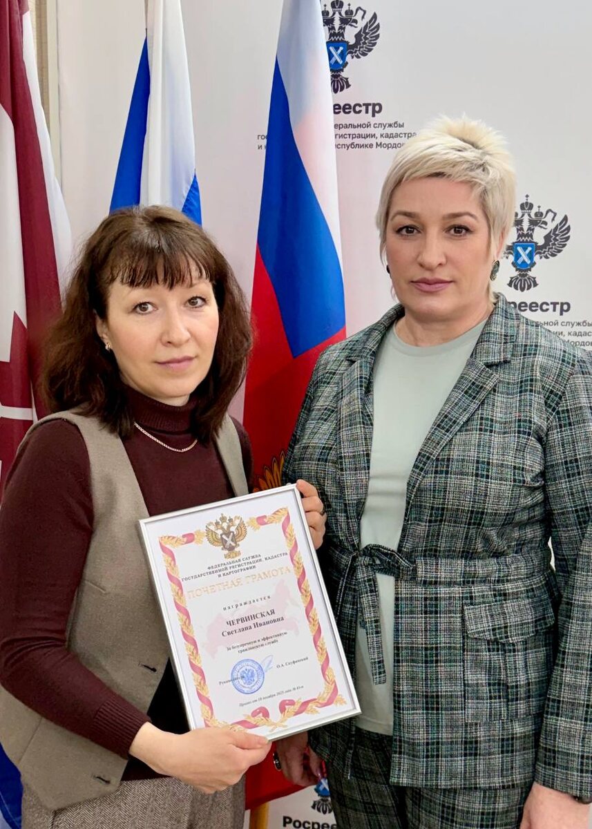 За безупречную и эффективную гражданскую службу Почётной грамотой Федеральной службы государственной регистрации, кадастра и картографии награждена Светлана Червинская, специалист-эксперт отдела государственной службы и кадров, правового обеспечения и мобилизационной подготовки Вручая награду Светлане Червинской, руководитель Управления Светлана Балескова высоко оценила ее профессионализм и поблагодарила за добросовестный труд