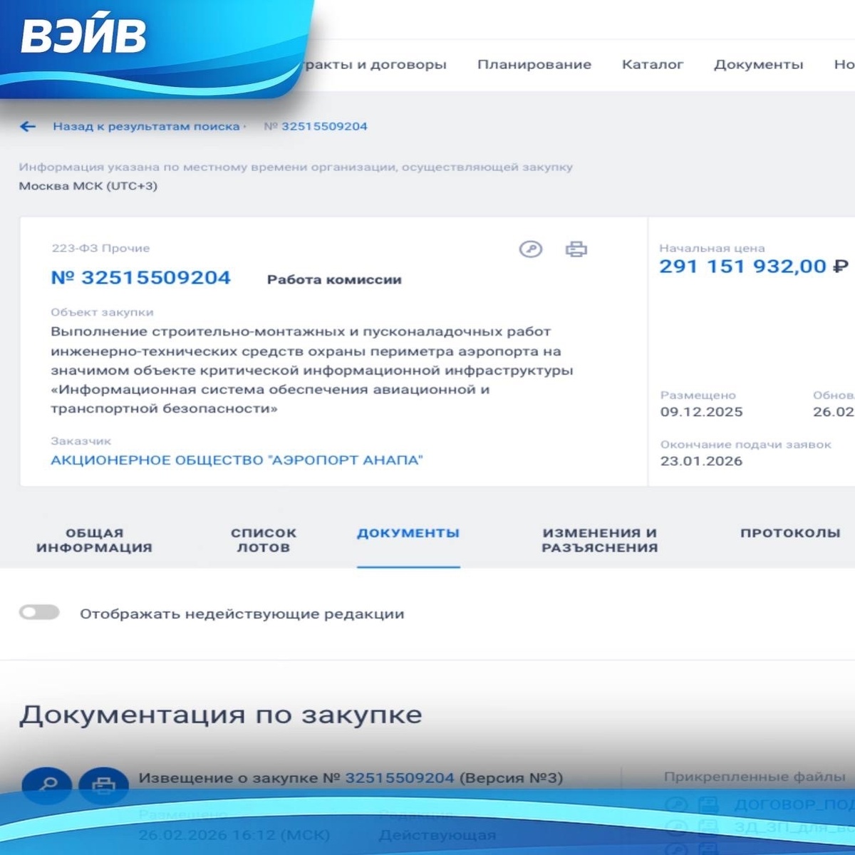 АО «Аэропорт Анапа» обновил тендер по выполнению строительно-монтажных и пусконаладочных работ инженерно-технических средств охраны периметра аэропорта. Соответствующая информация размещена в единой информационной системе «Закупки». На информационную систему обеспечения авиационной и транспортной безопасности владелец аэропорта выделяет 291 151 932 руб. Предположительно, речь идет о годовом обеспечении охраны на объекте.