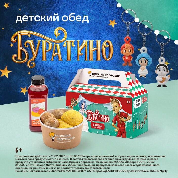 ! Внутри: 🥔 Печеный мэш 🐔 Фрикадельки из индейки 🥤 Ягодный морс 🎁 Брелок с героем фильма «Буратино» (8 видов в коллекции!) В коллекции — 8 персонажей: Буратино, Мальвина, Пьеро, Артемон, Арлекин, Алиса, Базилио и Карабас! Носите на рюкзаке, сумке или ключах 🎒✨ Собрали 2 млрд в прокате? Соберем и всю коллекцию! 😉 Ждем вас ❤️