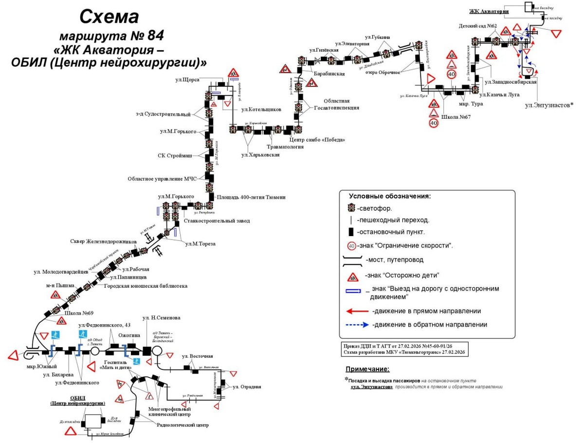 С 7 марта изменится схема движения маршрута регулярных перевозок № 84 «ЖК «Акватория» – ОБИЛ (Центр нейрохирургии)». В схему движения включается улица Раздольная в прямом и обратном направлениях. В схему включаются остановочные пункты «ул. Отрадная» в прямом и обратном направлениях. Из схемы движения исключаются улицы Звездная, Московская в прямом и обратном направлениях. Расписание для пассажиров общественного транспорта доступно в разделе «Расписание» на сайте tgt72.ru, в мобильном приложении «Тюменский транспорт», по бесплатному номеру телефона информационно-справочной службы 8-800-250-0722. МКУ «Тюменьгортранс»
