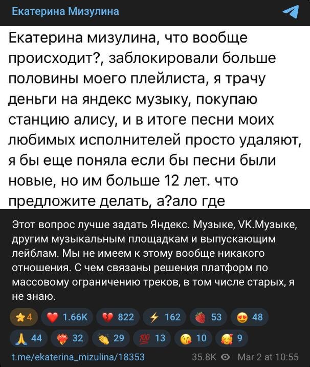 Директору «Лиги безопасного интернета» задали вопрос: «Екатерина Мизулина, что вообще происходит? Заблокировали больше половины моего плейлиста. Я трачу деньги на Яндекс.Музыку, покупаю станцию Алису, а в итоге песне моих любимых исполнителей просто удаляют». Ответ последовал такой: «Мы не имеем к этому вообще никакого отношения. С чем связаны решения платформ по массовому ограничению треков, в том числе старых, я не знаю». @mainstreamusic