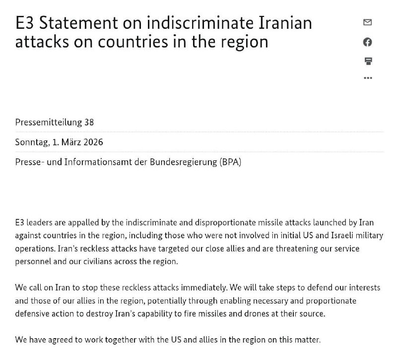 "Мы призываем Иран немедленно прекратить эти безрассудные атаки. Мы предпримем шаги для защиты наших интересов и интересов наших союзников в регионе, потенциально включая обеспечение необходимых и соразмерных оборонительных действий с целью уничтожения возможностей Ирана запускать ракеты и дроны", - говорится в совместном заявлении, опубликованном на сайте немецкого правительства. В соцсетях ранее сообщали об атаках Ирана на французскую военную базу в ОАЭ, а также о попытках атаковать британские войска на Кипре. 🤗 НАСОНОВ ▶️