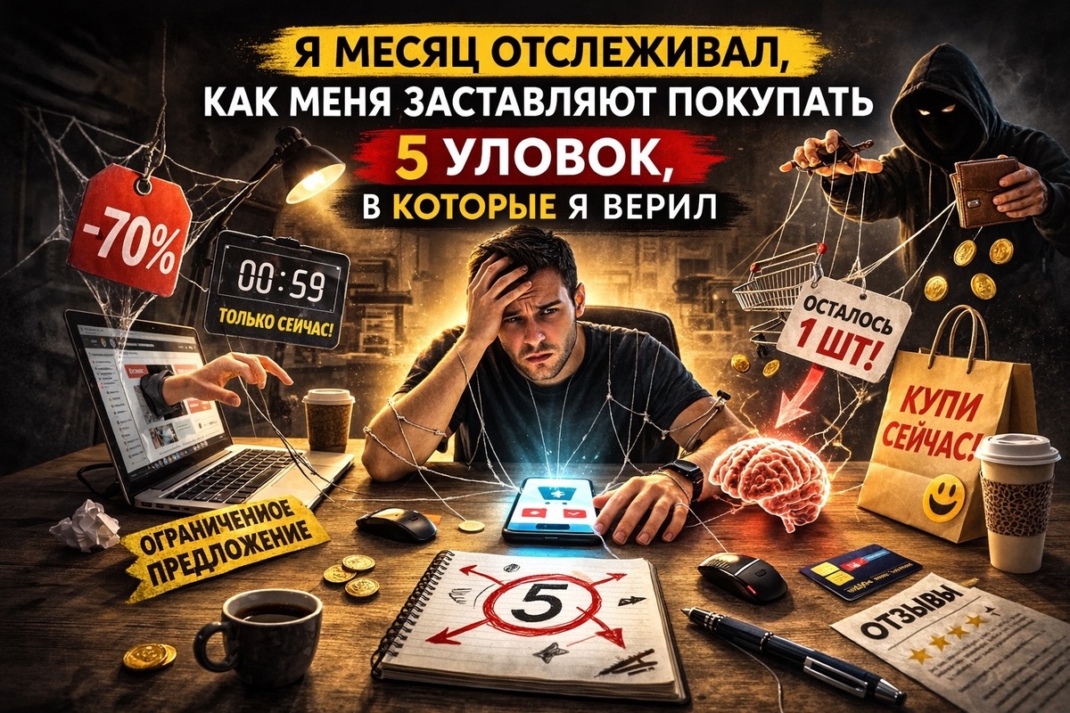 Я думал, что я «иммунен» к рекламе. Не смотрю ТВ, поставил блокировщик в браузере, не кликаю на баннеры. Я же осознанный потребитель! А потом я посмотрел на выписку из банка за месяц. 18 000 рублей ушло на вещи, которые я не планировал покупать. Одежда, гаджеты, подписки, «выгодные» наборы. И тут меня осенило: маркетинг больше не кричит на меня. Он шепчет. Он в рекомендациях Яндекс.Маркета. В push-уведомлении «ваша корзина ждёт». В красивом оформлении товара, которое выглядит дороже, чем стоит. Я решил провести эксперимент: целый месяц записывал каждый момент, когда меня пытались заставить купить. Вот 5 приёмов, которые сработали на мне. И я даже не заметил, как попался. Как это выглядит: «Осталось 2 штуки по этой цене»