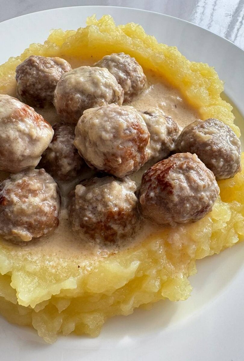 Вкуснейшие мясные колобки в сливочном соусе. Помню, по икеевским все тащились. Но домашние в тыщу раз вкуснее и есть понимание из чего они сделаны, когда не на поток, а для себя. Фарш из говядины - 500 гр. Фарш из свинины - 250 гр. Лук репчатый - 1 шт. Чеснок - 1 зуб. Сухари панировочные - 2 ст.л. Молоко - 5 ст.л. Соль, перец по вкусу Смешать фарш, добавить натёртый на мелкой тёрке лук, раздавленный зубчик чеснока, панировочные сухари вымешать руками. Отбить. Добавить молоко, соль и перец и вымешать ещё раз. Сформировать фрикадельки диаметром 3 см., сложить на равную поверхность, накрыть пищевой плёнкой и убрать в холодильник на 2 часа. Обжарить фрикадельки на масле гхи до слегка золотистой корочки, а затем залить соусом и тушить 5 минут на медленном огне. Соус рецепт здесь.