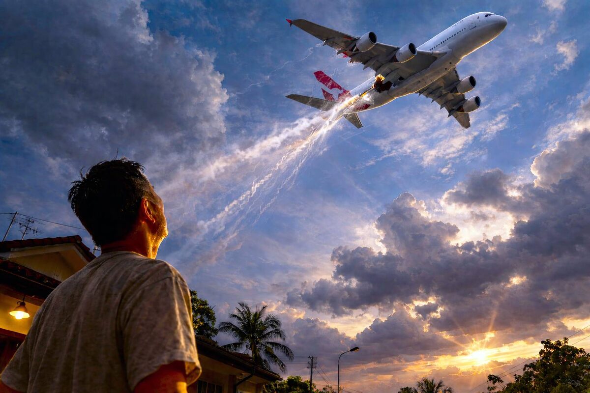 Резкий звук нарушил утреннюю тишину на острове Батам. Что-то большое пробило крышу здания насквозь: вошло сверху, пробило кирпичную стену и застряло в земле. Люди выбежали на улицу. Подняли глаза. Высоко над головой, в утреннем небе Индонезии, огромный белый самолёт уходил на север.