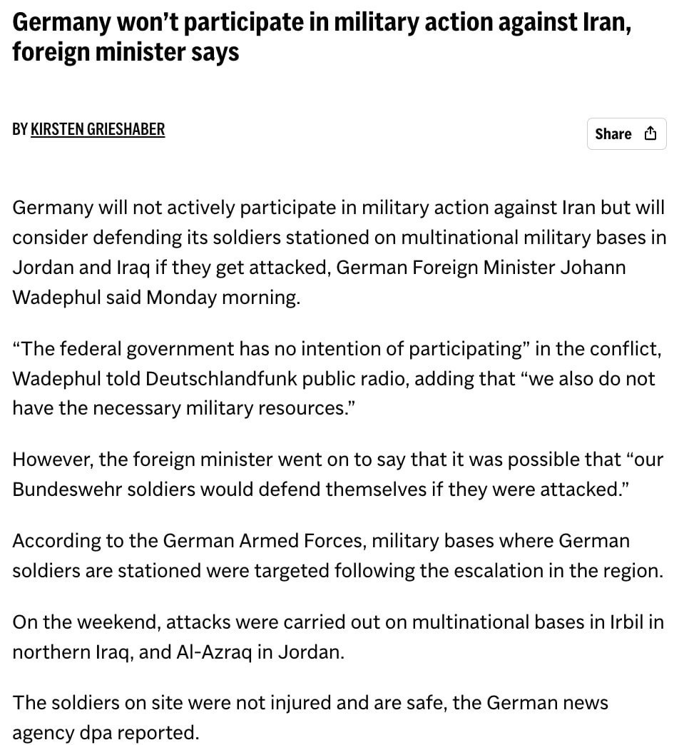 намеревается участвовать в войне против Ирана. «Федеральное правительство не намерено участвовать» в конфликте, сказал Вадефуль в эфире общественного радио Deutschlandfunk, добавив, что «у нас также нет необходимых военных ресурсов». При этом министр отметил, что «наши солдаты бундесвера будут защищаться, если на них нападут». Сальное Дифлопэ