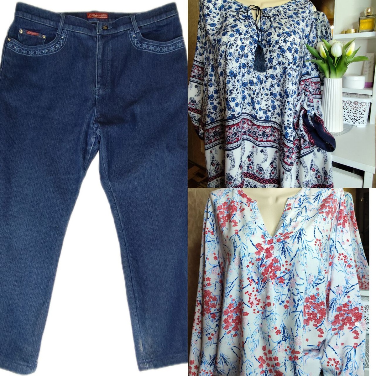 одежды, а с ними хорошо сочетаются просторные блузки, худи, туники. На фото замечательный комплект, состоящий из джинс, которые тянутся за счёт стрейча и легких блузок из вискозы. Купив такой комплект одежды, вам обеспечен комфорт и красивый, стильный образ. Узнать размеры и составы тканей можно перейдя по ссылкам👇: https://t.me/shkatylkasecond/344?single https://t.me/shkatylkasecond/154?single Джинсы из этого комплекта ПРОДАНЫ!