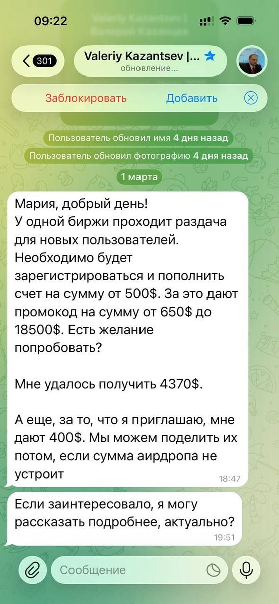 ! Сегодня мне написал один из моих подписчиков, и прислал скрин мошенника - точнее клон моего аккаунта. 1. По теме крипты, аирдропов, и других производные, как и то что про арбитраж криптовалют, и торговли на биржах криптовалют ой, не кому не предлагаю этой темой заниматься, если вы начинающий инвестор и трейдер. И таких сразу блокируйте и отправляйте блок и жалобу. 2. Как определить мошшеника - вам показывает телеграмм когда произошло изменение в данном аккаунте. На скрине видно, что фотография изменена пару дней назад. Это очень подозрительно. Не в коем случае не переходите по ссылкам, ко орые вам отправляют не знакомые. И всем хорошего дня!