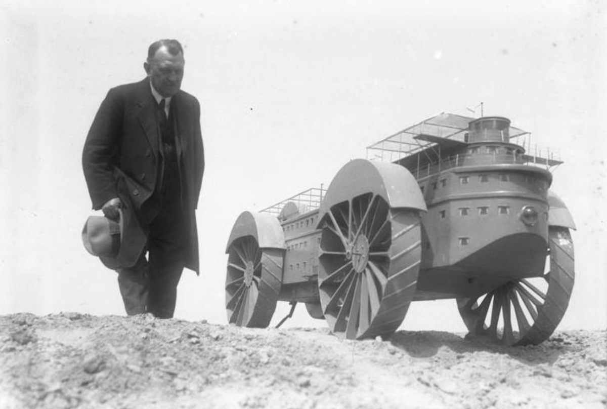 В прямом смысле. На снимке из собрания Федерального архива Германии (Bundesarchiv) показан концепт от немецкого инженера Йоханна Кристофа Бишоффа. Модель была сделана для его проекта «Пустынный корабль». Автор задумал гигантский колесный «роскошный лайнер», способный перевозить сотни людей прямо через пустыню. Это было бы многопалубное судно длиной около 40 м с огромными колесами до 12 м в диаметре, дизельными двигателями и комфортабельными каютами. Он работал над этим замыслом около пяти лет, оформлял патенты и создавал миниатюрные модели, чтобы показать, как такая могла бы выглядеть и работать. Но дальше вот такого мини-корабля дело не пошло. Подписаться на канал: 📱 Telegram / 💜 MAX / все наши каналы