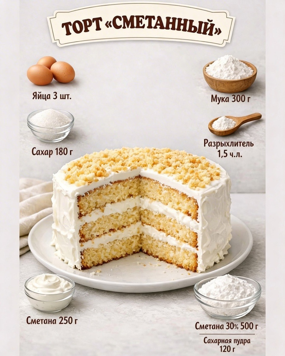 🍰 Коржи. Яйца 3 шт. Сахар 180 г Сметана 250 г Мука 300 г Разрыхлитель 1,5 ч.л. Крем: Сметана 30% 500 г Сахарная пудра 120 г Ваниль по вкусу Взбить яйца с сахаром до пышной массы. Добавить сметану и перемешать. Постепенно ввести просеянную муку с разрыхлителем, тщательно перемешивая. Выпекайте около 25-30 минут при 180С. Разрезать на коржи. Взбить сметану с сахарной пудрой и ванилью. Промазать коржи кремом, складывая их друг на друга. Убрать торт в холодильник на несколько часов для пропитки.