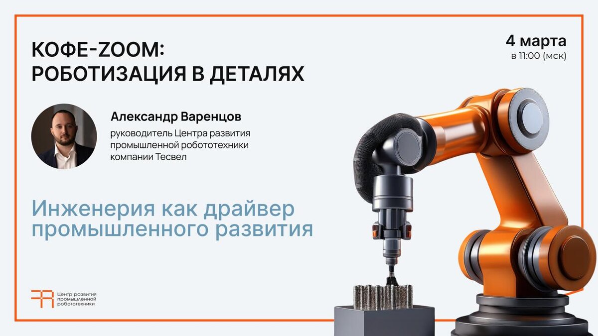4 марта в 11:00 (мск) встречаемся на спецвыпуске Кофе-zoom, посвящённом Дню инженерии, чтобы поговорить о том, без чего роботизация невозможна. Тема: Инженерия как драйвер промышленного развития В гостях: Александр Варенцов, руководитель Центра развития промышленной робототехники компании Тесвел. В прямом эфире обсудим: ⚫️почему хороший инженер стоит дороже любого робота и как меняется его роль в эпоху автоматизации; ⚫️как выстроен жизненный цикл инженерных проектов; ⚫️где могут возникнуть неожиданные сложности и как их решать; ⚫️отраслевая практика на примерах кейсов компании «Тесвел». Запись эфира смотрите в нашей группе ВКонтакте. @prom_robotics ✔️ Мы в МАХ