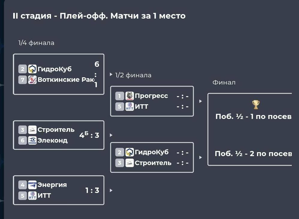 Прогресс занял первую строчку по итогам регулярного чемпионата и отправился в стадию Полуфинала. Сыграем с ХК ИТТ. Напомним, что именно ИТТ в прошлом сезоне обыграл нас в финальной серии. Приходите на хоккей и болейте за наши команды.