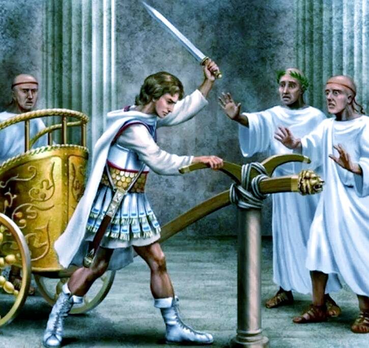 А одна из самых легендарных историй связанных с его именем - это история про гордиев узел. Считалось что тот, кто распутает узел, завязанный фригийским царём Гордием, станет властелином всей Азии. Александр рассудил просто и творчески: "Зачем гадать. Руби с плеча!". И разрубил этот узел мечом. И пророчество исполнилось.