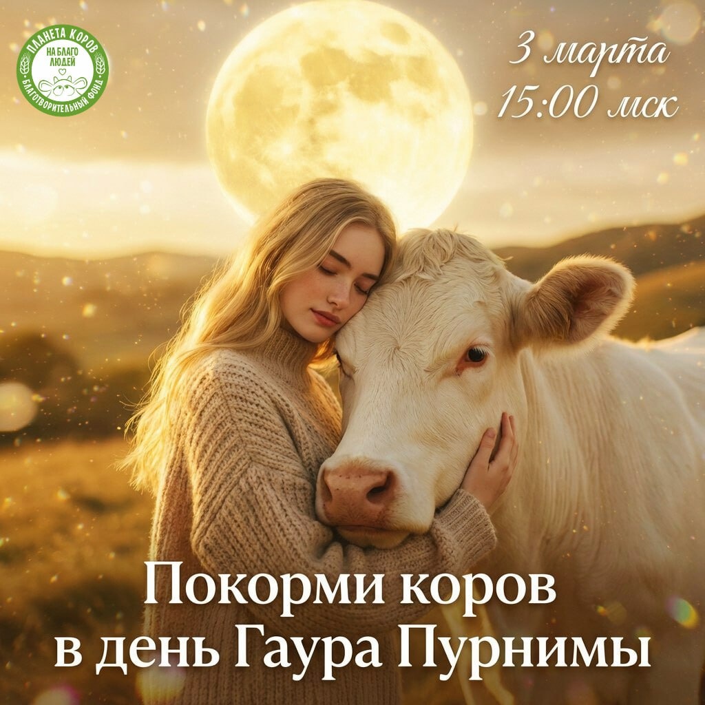 💛 Пишите имена своих родных и друзей в бот: https://t.me/Planetaofcowsbot 🌝 В этот день на Земле проявляется уникальное сочетание мистической силы Лунного затмения и чистой, всепрощающей энергии Золотого Полнолуния Гаура Пурнима. 💛 Это священный день, когда энергия сострадания и любви проливается на Землю особенно сильным потоком. Мощное очищение через затмение приходит вместе с наполнением чистейшим светом Золотого Полнолуния. 🐮 В этот сияющий день мы приглашаем вас на наше онлайн кормление. Будем кормить от вашего имени коровушек и вместе окунемся в поток Божественной энергии! В древних трактатах говорится, что в день Гаура Пурнимы, заботясь о корове, человек настраивается на исцеляющие вибрации безусловной любви. Корова - символ жертвенного, материнского служения. Кормя коровок, мы учимся у них этой безусловной любви и становимся счастливее. 💛 В это благостное Полнолуние молитвы обретают крылья. В Ведах говорится, что коровушка - проводник наших молитв к Высшим силам. Ког