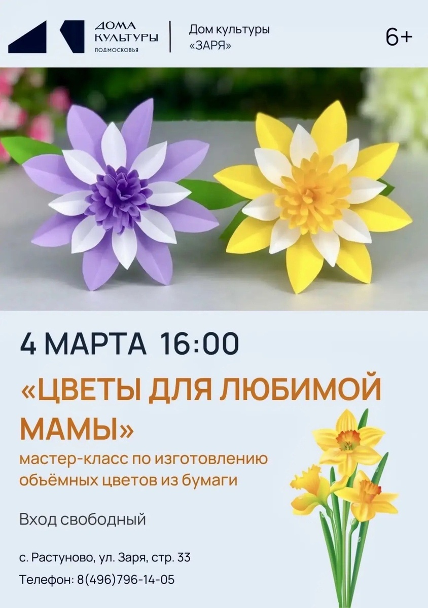 ✨ ✂️ МАСТЕР-КЛАСС ✂️ Сельский Дом культуры «Заря» приглашает на мастер-класс по изготовлению объёмных цветов из бумаги «ЦВЕТЫ ДЛЯ ЛЮБИМОЙ МАМЫ» 🚫 Возраст: 6+ 📆 04.03.2026🕒16:00 🏢 Сельский дом культуры (СДК) «Заря» 📍 г.о.Домодедово, с.Растуново, ул.Заря, д.33 💰 Вход свободный❗️ ✅ Мероприятия Домодедово https://dzen.ru/id/66f10385cc4c5a16f7b5fb02 http://vk.com/domodedovo_events http://dzen.ru/domodedovo_events