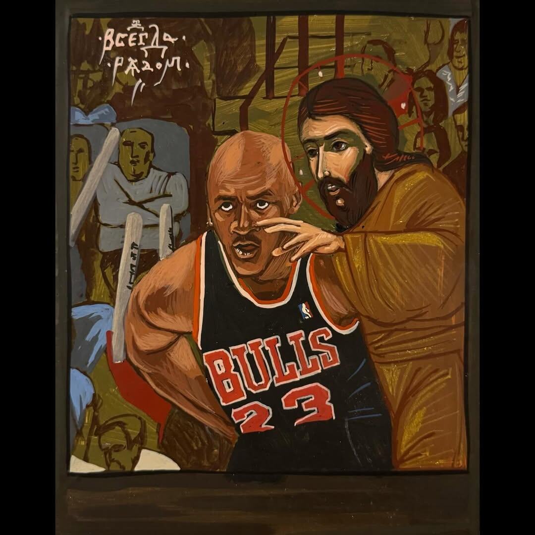 ». Это не канонические иконы, а именно религиозные картины, где Христос показан внутри повседневной жизни: рядом с людьми, в бытовых и социальных ситуациях, в том числе в спорте. До иконописи Андрей много лет занимался граффити, а затем пришёл к церковному искусству и профессионально учился иконописи в православном университете ПСТГУ. @bbollerroom