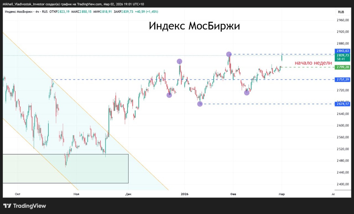 🚀 +1,5% $IMOEXF доходит до отметок сентября 2025. Закрепиться выше пока не можем, поэтому боковик продолжается +1,2% $MXH6 фьючерс на индекс на МосБиржи уперся лбом в зону сопротивления. Для глобального разворота разрисовал нужную нам траекторию. Конечно же сильно влияет на рост нефтегазовый сектор. Посмотрите на поводырей(4 скрин). Лукойл, Роснефть, Татнефть и Газпром в хорошем плюсе. Поэтому если будет дальше продолжаться конфликт, то цены пойдут еще выше. Присматриваем обязательно за этим сектором. Русснефть, Башнефть, Сургутнефтегаз и Газпромнефть. Особенно пристальное внимание к $NVTK Новатэк, который ломает глобальную трендовую. Будем искать покупки на младшем тайминге. ✍️ Можно будет еще понаблюдать за металлургами на фоне роста цен на металлы. Русал, ММК, Полюс, Селидгар и НЛМК Добавьте в комментариях, если что-то забыл или достойно внимания! 😉