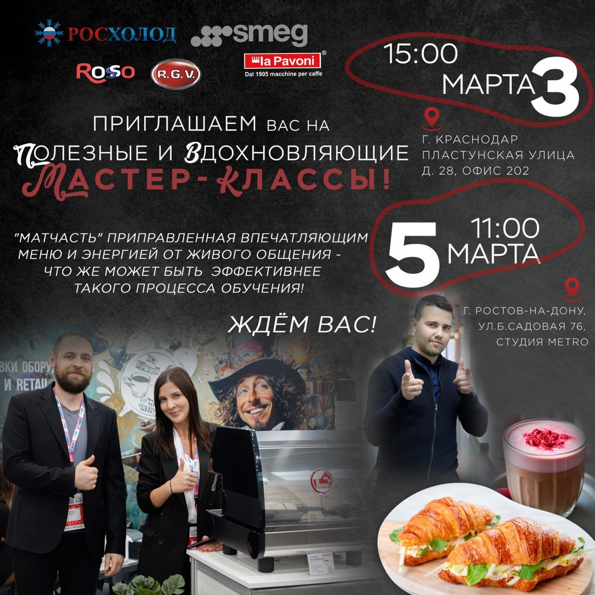 ! ДВА мастер‑класса от Росхолод, Smeg, La Pavoni, Rosso, RGV! ДВА южных мегаполиса: Краснодар и Ростов-на-Дону! ДВА шанса набраться полезных знаний перед горячим сезоном! И бесконечное ♾️ вдохновение - берите сколько сможете унести! Погрузитесь в атмосферу гастрономического искусства с профессиональным оборудованием Smeg, La Pavoni, Rosso, RGV. 🗓 3 марта 15:00 📍 Место: г. Краснодар, Пластунская улица, д.28, офис 202 🗓 5 марта 11:00 📍 Место: г. Ростов-на-Дону, улица Большая Садовая, д.76, студия Metro "Матчасть" приправленная впечатляющим меню и энергией от живого общения- что же может быть эффективнее такого процесса обучения! Что будем готовить? - Жасминовый латте с сублимированной малиной - Круассаны с ванильной грушей, кремовой рикоттой, пикантной рукколой и хрустящим грецким орехом - Куриная грудка су‑вид с шафрановым соусом, булгуром и киноа - Шоколадный фондан с мороженым 📲Спешите записаться у своего персонального менеджера! Количество мест ограничено! Ждём Вас!