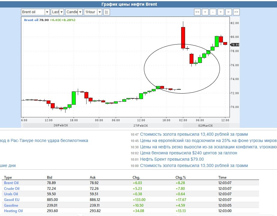 Торги нефтью открылись сегодня хорошим гэпом в 10 долл, с 72 до 82$, превысив летний максимум 2025 года