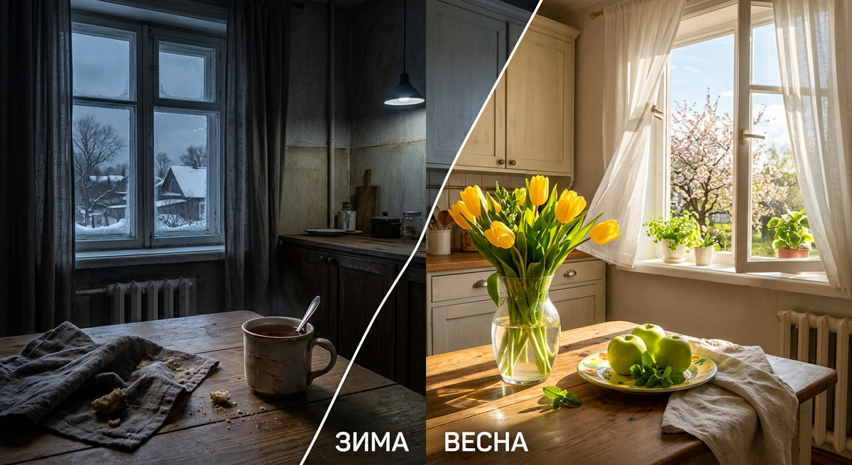Приветствую вас, мои дорогие хранительницы очага! С вами Виктория, я как никто другой, знаю это коварное состояние: на календаре уже весна 2026 года, а внутри всё еще «февраль». Утром темно, вечером темно, а кухня, которая должна быть местом силы, превращается в место второй смены у плиты. Знакомо чувство, когда заходишь утром варить кофе, а интерьер будто давит? Темные тона, тяжелые ткани, уставшие вещи... Психологи называют это «визуальным якорем». Это когда обстановка фиксирует нас в определенном эмоциональном состоянии — в данном случае, в зимней спячке. Как коуч и эксперт по уюту, я запрещаю вам хандрить! Нам не нужен капитальный ремонт или новая мебель, чтобы впустить весну. Достаточно изменить всего три детали. Я проверила это на своей кухне, и результат сработал как мощный антидепрессант. Давайте «взломаем» пространство. 1. Текстильная «детоксикация» 🧺 Первое, что мы делаем — убираем всё темное, плотное и шершавое. Зимой нам хотелось укутаться, поэтому на кухне жили махровые п