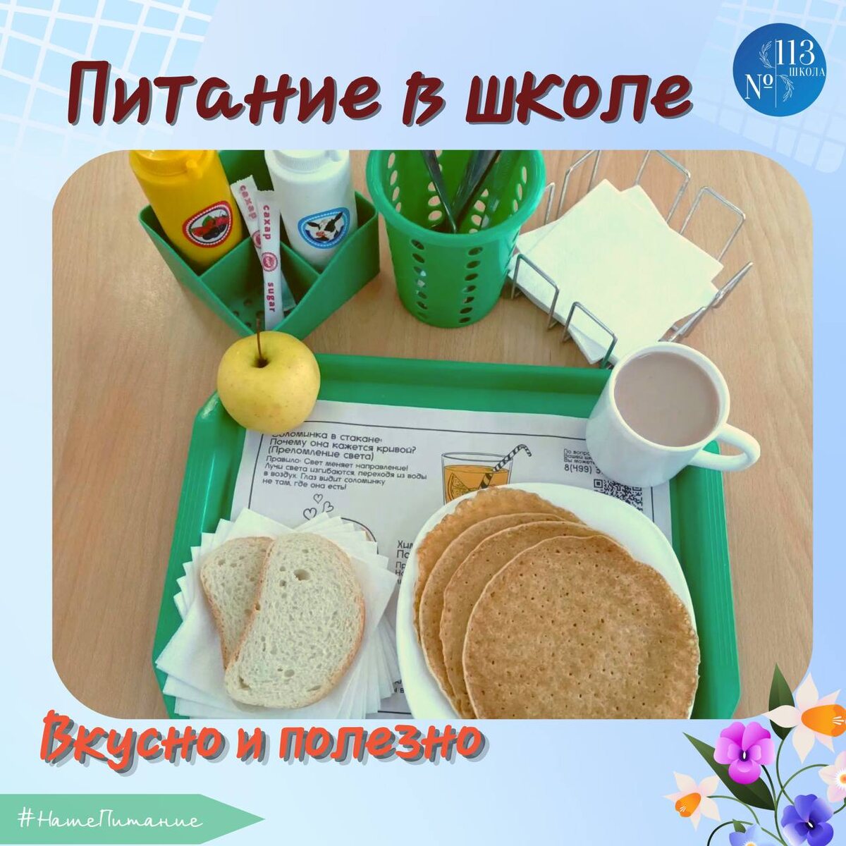 ♥️ Поздравляем всех с началом весны! Желаем всем ребятам приятного аппетита и хорошего дня 🌸 Сегодня на завтрак: 🥞 Блинчики 🍓 Варенье ягодное 😋 Молоко сгущеное ☕️ Чай / Какао на молоке 🍋 Лимон 🍎 Яблоки 🍞 Хлеб Актуальное меню с подробным описанием каждого блюда, можно посмотреть на официальном сайте нашей школы ⬇️ https://sch113uz.mskobr.ru/roditelyam/vse-voprosi-o-pitanii 📲 Подпишись на нас в МАХ #ДОНМ #Школа113 #НашеПитание