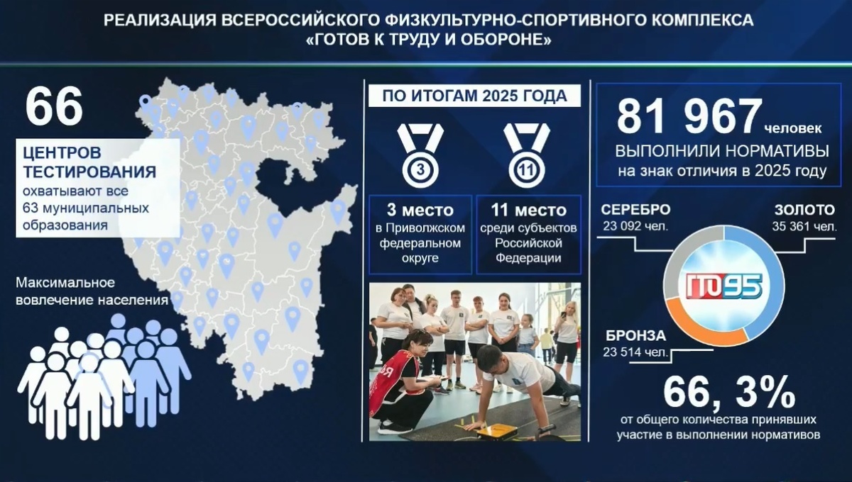 О развитии комплекса «Готов к труду и обороне» в республике рассказал на оперативном совещании в правительстве РБ заместитель премьер-министра – министр спорта Башкирии Руслан Хабибов. Всего в 2025 году нормативы «ГТО» на знак отличия выполнили более 81 тысяч человек, причем на золото – 35361 человек. Значки получили более 66 процентов от общего количества принявших участие в выполнении нормативов Этот показатель стал на 7 процентов выше, чем в прошлом году. – По итогам 2025 года Башкирия продемонстрировала значительный прогресс, заняв 3-е место в Приволжском федеральном округе по выполнению плана Федерального оператора по количеству приступивших к выполнению нормативов ГТО и 11 место среди всех субъектов РФ. В 2024 году у нас было 17 место, – отметил Руслан Хабибов. Фото: скриншот трансяции.