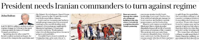 Он предлагает Вашингтону найти иранских командиров (в армии, полиции и даже КСИР), готовых выступить против своего режима. А еще – нескольких аятолл, которые призовут религиозных лидеров уйти из политики. Болтон считает, что мотивы таких людей не важны, главное – чтобы они перешли на «побеждающую сторону». Автор исходного поста саркастически сравнил это с советом Тегерану найти продажных американских генералов, чтобы те повернули оружие против Трампа. Сработало бы? Подписывайся