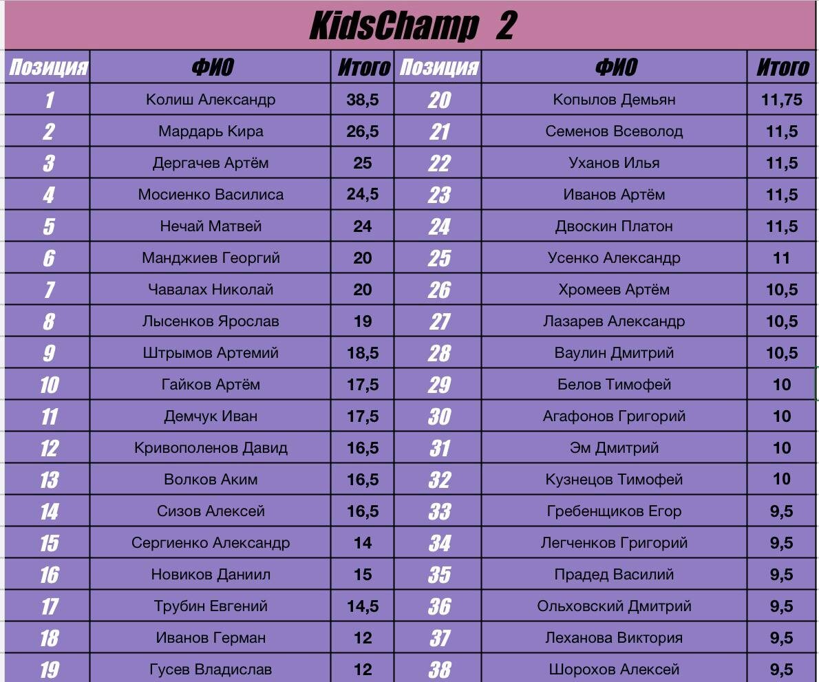 🏆 Лидером детского чемпионата с серьезным отрывом является Колиш Александр🔥 Но главная битва еще впереди! 26 апреля будет финальный турнир и до этого дня еще многое может поменяться😉 С условиями чемпионата можно ознакомится в закрепленном посте нашего канала📎 Успейте забронировать себе место на ближайших турнирах по ссылке ниже 👇 https://docs.google.com/forms/d/1qmNHJFhPagi_VaTjnU5nGCeuYnNYMw5JXkt0ErVvk6c/edit?pli=1#responses Или на нашем сайте 👇 chesschamp.ru Контакты для связи: 📞8(931)362-43-99 - Ибрагимов Фарид(организатор)