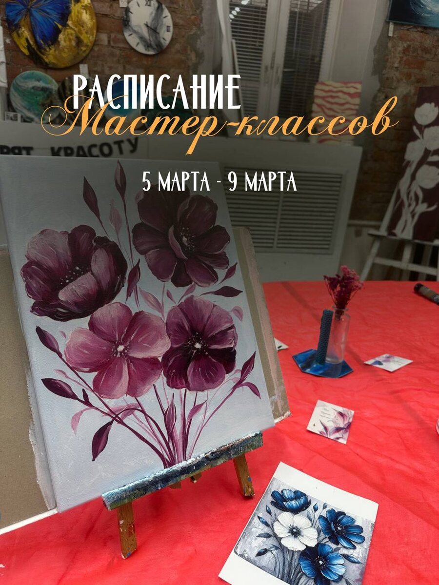 5 марта - 9 марта! Мастер-классы и их 💲 : ✨Винная арт-вечеринка (живопись маслом/акрилом) 3500₽ ✨Интерьерная живопись сусальным золотом/текстурной пастой 3500₽ ✨ Светящаяся картину «Луна» 4500₽ ✨Акварельный бранч (живопись акварелью) 2500₽ А если ты придешь не одна ☝🏼 для каждого участника и для вас будет -15% от стоимости 🥂На всех занятиях мы угостим вас игристым и вкусными сладостями. У нас нет лимита и все включено в стоимость. 💌 записаться на урок