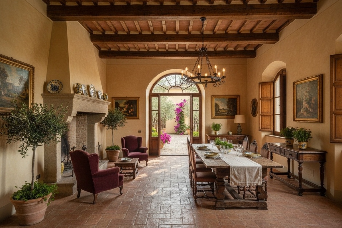 Италия — страна, где архитектура и декоративные искусства формировались веками. История стиля уходит к эпохам Ренессанса и барокко, когда ценились симметрия, натуральные материалы и выразительный декор. Позже появились тосканский кантри и средиземноморское направление, более простые, но не менее атмосферные.