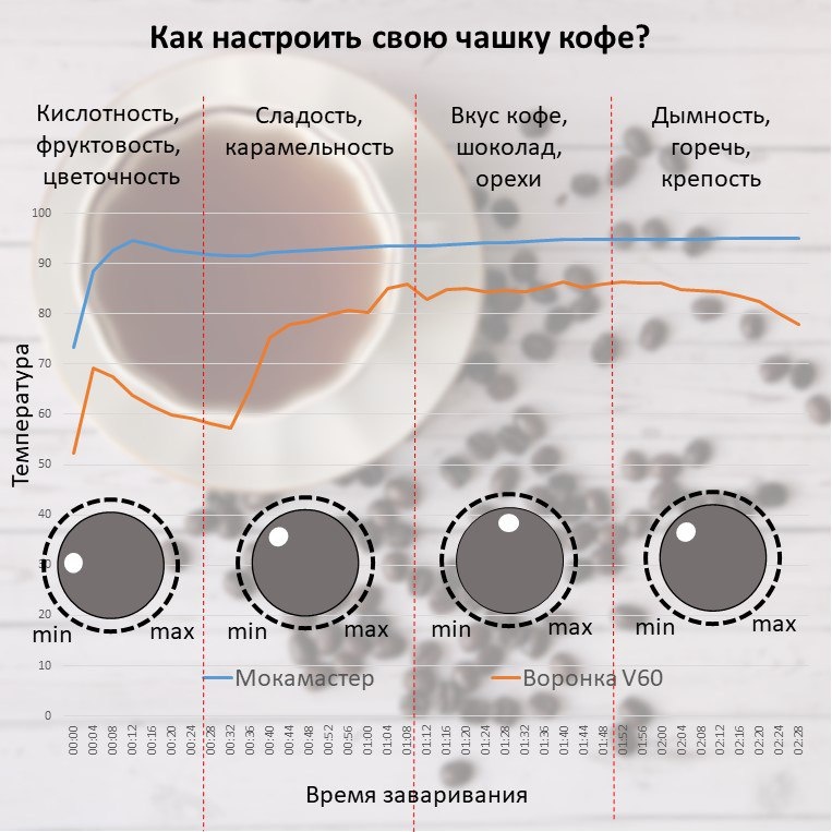 S. эспрессо тоже, но об этом позже) Помните, я в прошлых постах графики рисовал, про воронки рассуждал, про Moccamaster? Так вот, если отбросить цифры, суть простая. Кофе заваривается в воде. Всё. А разные методы — это просто способы управлять тем, как вода контактирует с зерном. Что вообще происходит при заваривании Если коротко: вещества из кофе растворяются не одновременно, а по очереди. Примерно так: Сначала — кислоты, фрукты, цветы. Потом — сладость, карамель. Затем — шоколад, орехи, классический кофейный вкус. И под конец — дым, горечь, «крепкость». Это как эквалайзер. Хотите яркую кислинку — остановитесь пораньше. Хотите плотную горечь — дайте воде поработать подольше. Метод заваривания и температура — это ваши ручки на этом эквалайзере. А почему для воронки и френч-пресса и того же моккамастера нужна разная температура? Тут всё упирается в то, как остывает кофе во время заваривания. В воронке вода льётся постепенно, проходит через кофе и утекает в чашку. Кофейная гуща всё