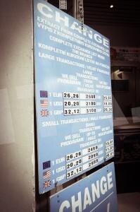 В Чехии с ноября вступила в силу нормативная мера, направленная на защиту клиентов пунктов обмена валюты. Она должна oградить от мошенничества в первую очередь туристов, которые часто становились жертвами недобросовестных обменников. Где безопасно обменять деньги в Праге, я описывал здесь. Раньше на табло многих обменных пунктов царила путаница. В некоторых местах были указаны лишь два слабо различающихся курса — для мелких и крупных сумм, аVictor на некоторых — откровенное жульничество. На снимке слева — стенд обменника на Капровой улице, неподалеку от того банка, который рекомендовался ранее. Вверху указаны курсы для «Large transactions» — крупных операций. Ниже — для стандартных. Как видно, курс продажи евро везде 26,26, а покупают их не по 25,03 (приемлемый курс), а по 15,01… Теперь же обменные пункты обязаны публиковать только один курс, причём если указано несколько, то наименее выгодный должен быть выделен визуально. Информация также должна быть легко читаемой. На приведённом пр