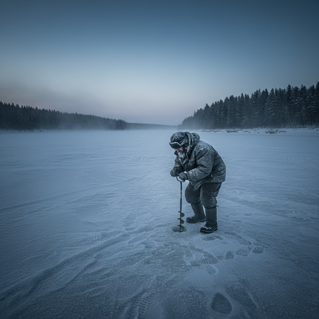 Лунка открылась чёрной водой, и оттуда сразу потянуло речным холодом — живым, настоящим. Он опустил снасть, уселся на ящик, подтянул воротник. В такие минуты важно не думать о пустом. Важно думать о доме — но так, чтобы не торопить руки.