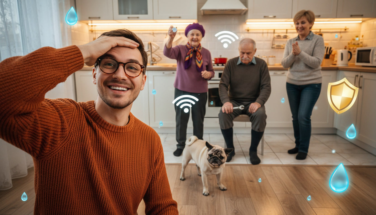 Мы бросились на помощь. Под раковиной бил маленький, но очень решительный фонтан. Датчик плавал в луже, но продолжал героически пищать. Благодаря тому, что мы услышали сигнал мгновенно, вода не успела даже выйти за пределы кухонного коврика. Степан Иваныч, мокрый, но притихший, быстро перекрыл главный вентиль.