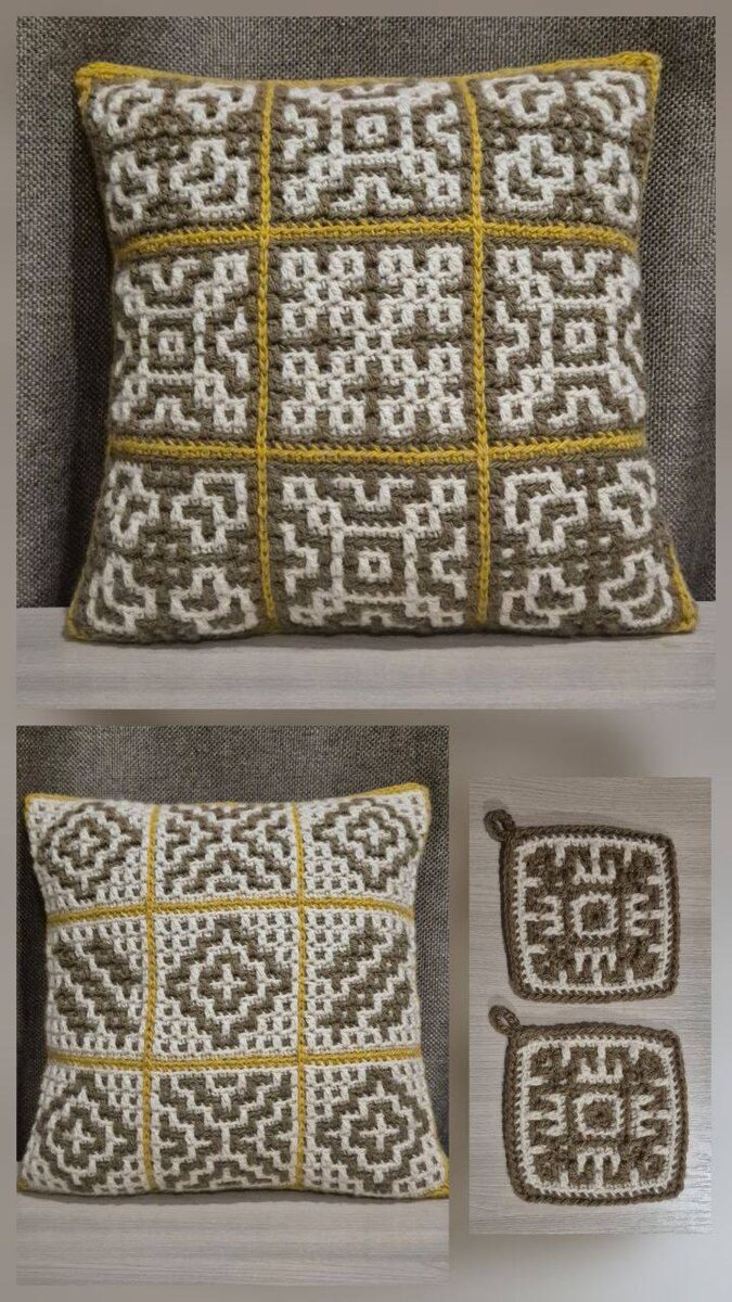 Новости наших чатов Наталья здорово поработала с ленивым пэчворком — ничего не сшиваем, вяжем единым полотном. Узоры вы найдете в каталоге схем книги «Вязаный дом». Наталья: «Связалась подушечка в стиле Пэчворк + прихваточки. Размер 32×32. Карачаевская двунитка в моточках, крючок 4,5».