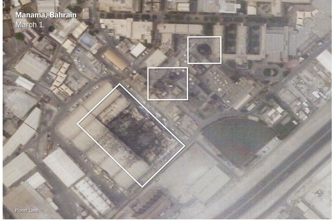 На снимках видны: ▪️разрушения нескольких зданий на базе ВМС США в Бахрейне; ▪️несколько точных ударов по ангарам на авиабазе Али аль-Салем в Кувейте; ▪️удар по месту расположения личного состава на авиабазе в Эрбиле в Иракском Курдистане; ▪️пожар после прилета по порту Джэбэль Али в ОАЭ. Военный Осведомитель
