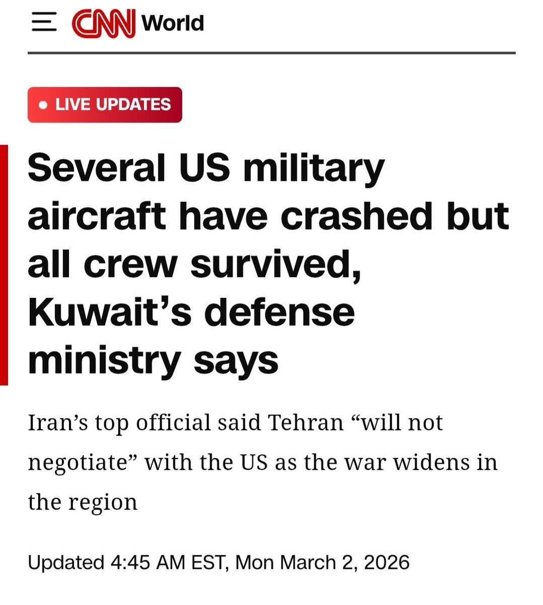 CNN со ссылкой на Минобороны страны пишет, что командование США сейчас "пытается выяснить причину произошедшего". Предварительно, все экипажи успели катапультироваться. Подпишись ТГ / Подпишись МАХ