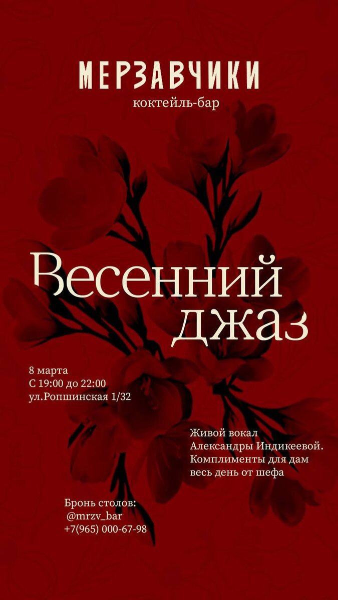 » 🌸 Прекрасные дамы, бронируем столики на 8 марта! В честь этого красивого праздника бар «Мерзавчики» пригласил певицу Александру Индикееву. Она исполнит любимые композиции, наполнит вечер нежностью и настроит на особую атмосферу. А еще каждую гостью в этот день угостят особенным сладким комплиментом. 🗓 начало первой посадки в 19:00, второй – в 21:00 📞 бронь +7 (965) 000-67-98 или @mrzv_bar 📍 Ропшинская ул., 1/32 Подписывайся на Пойдем выпьем