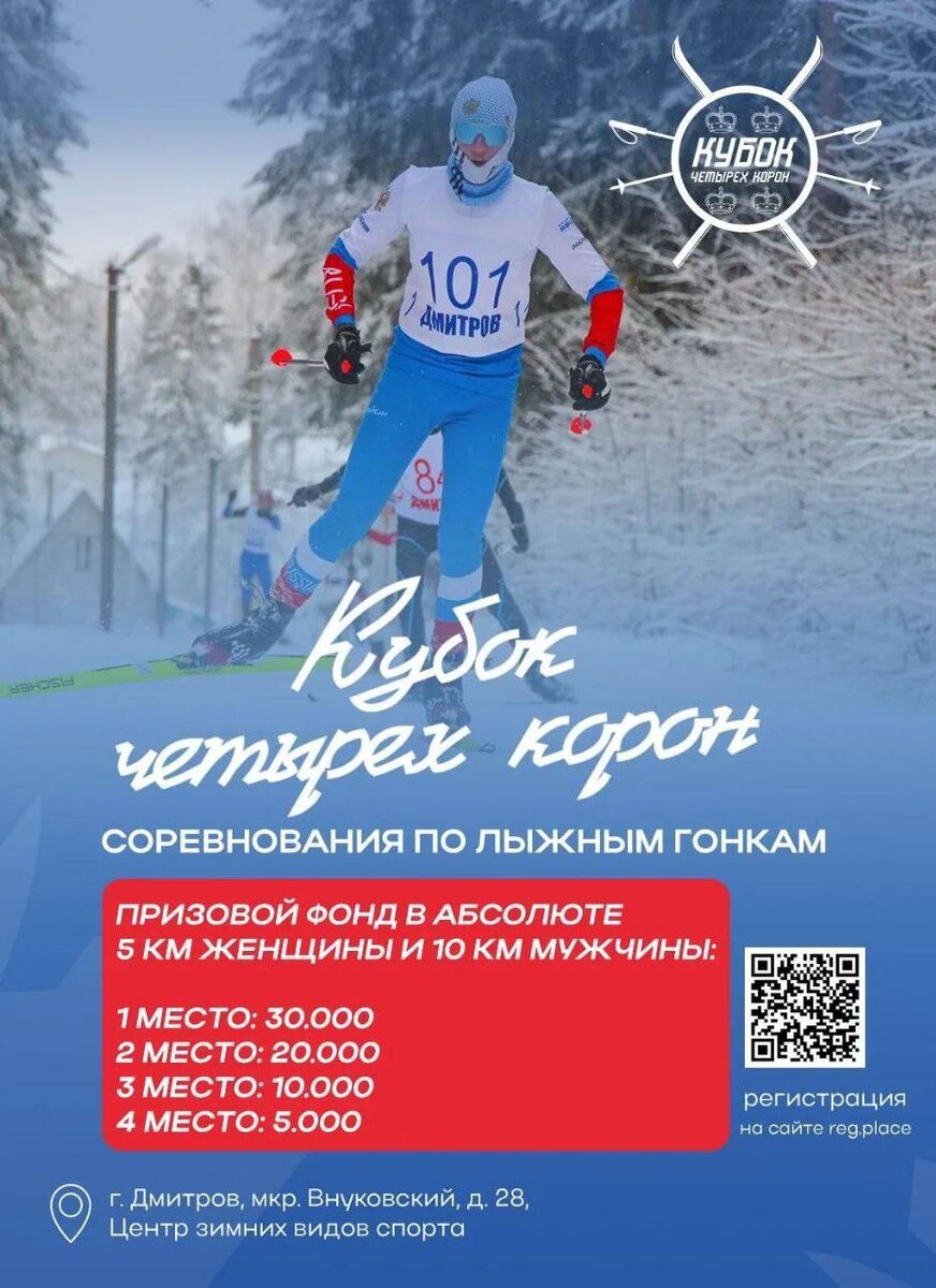 ЧЕТЫРЕХ.КОРОН. 🏆 Приглашаем вас на яркое спортивное событие этой зимы! В Дмитрове состоится спортивный праздник: «Кубок четырех корон» по лыжным гонкам. Дистанции на любой вкус и уровень подготовки: 🔹 1 км 🔹 3 км 🔹 5 км 🔹 10 км Но это не просто гонка! Это - настоящий фестиваль: 🎉🎉🎉 РУССКИЕ ЗАБАВЫ — Перетягивание каната — проверь свою богатырскую силу - Катания на лошадях — Интерактивные площадки в народном стиле — Веселая музыка и развлечения для всех гостей 👨👩👧👦 СЕМЕЙНЫЙ СТАРТ Специальный фан-заезд для всей семьи без ограничения по возрасту — приходите с малышами, родителями и бабушками! 🏅 НАГРАДЫ — Все участники гонки получат памятные медали на финише — 4 самых быстрых финишера получат — Корону, символ соревнований и еще «кое-что🔥» 📍 Где: г. Дмитров, мкр. Внуковский, д. 28. Центр зимних видов спорта 🗓️ Когда: 14 марта 2026, старт в 10:00. ✍️ Обязательная регистрация на сайте https://reg.place/events/vhgivioa Приходите семьями, зовите друзей — будет спорти