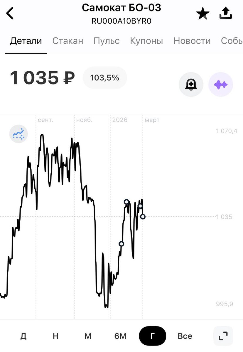 счете $VTBR дает мне 15% на ежедневный остаток. Я держал там все свободные деньги до последнего дня месяца, когда надо пополнять последнюю незакрытую кредитку от $SBER Итого я за февраль получил 1877,39руб процентами, которые в равных долях закинул на брокерский и #иис Докупил $IRAO $ASTR и #облигации ✅ Самокат БО-03 - $RU000A10BYR0 - купон 27% #прояви_себя_в_пульсе
